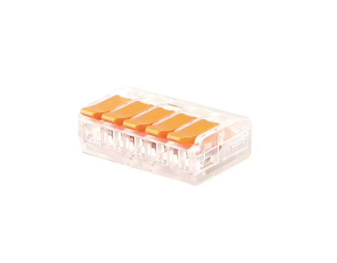 Conector para empalmes rápidos, sin tornillos ni herramientas, solo necesita empujar la palanca naranja hacia atrás para abrir el conector y realizar una conexión rápida y sencilla.