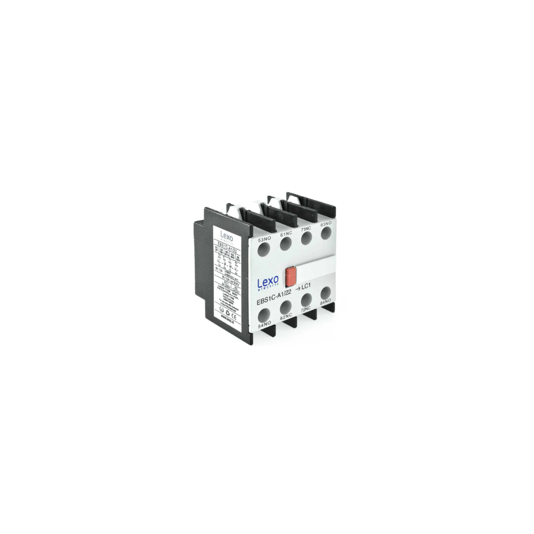 El CONTACTO AUXILIAR SOBREPUESTO EBS1C-A1/22 2NO+2NC es un elemento muy necesario, ya que los contactares vienen mínimo con un contacto auxiliar, pero muchas veces al armar nuestros circuitos, requerimos de más de uno o dos contactos auxiliares; entonces, recurrimos a estos blocks auxiliares que proveen de uno, dos o más contactos auxiliares para el diseño de nuestros circuitos.
